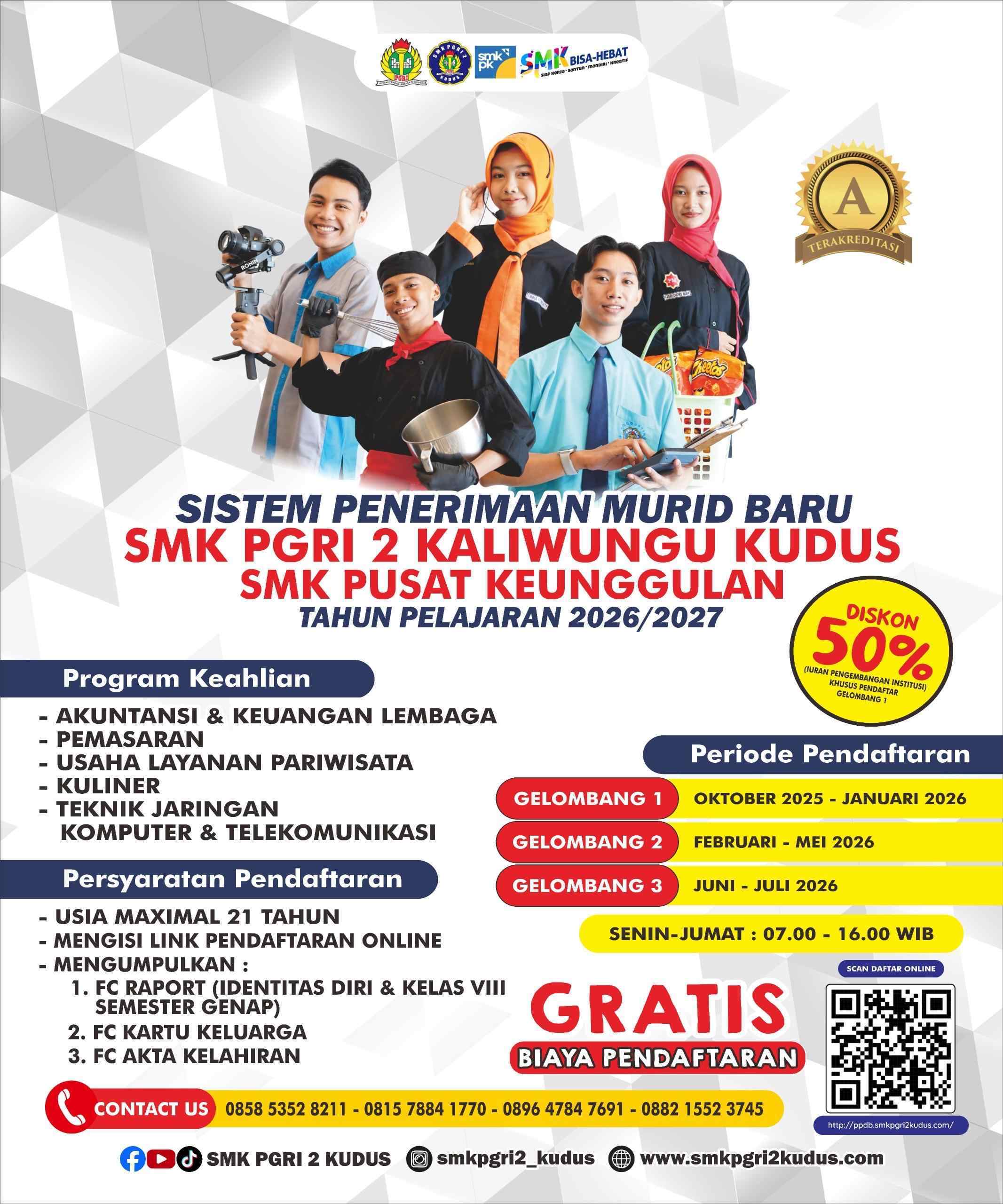 SMK PGRI 2 Kudus berada di Jln. Jepara kaliwungu Kudus, no tlp. (0291) 434944, Kode Pos 59361, E-mail : smpgr2kaliwungu@gmail.com , webside : https://smkpgri2kudus.sch.id.
